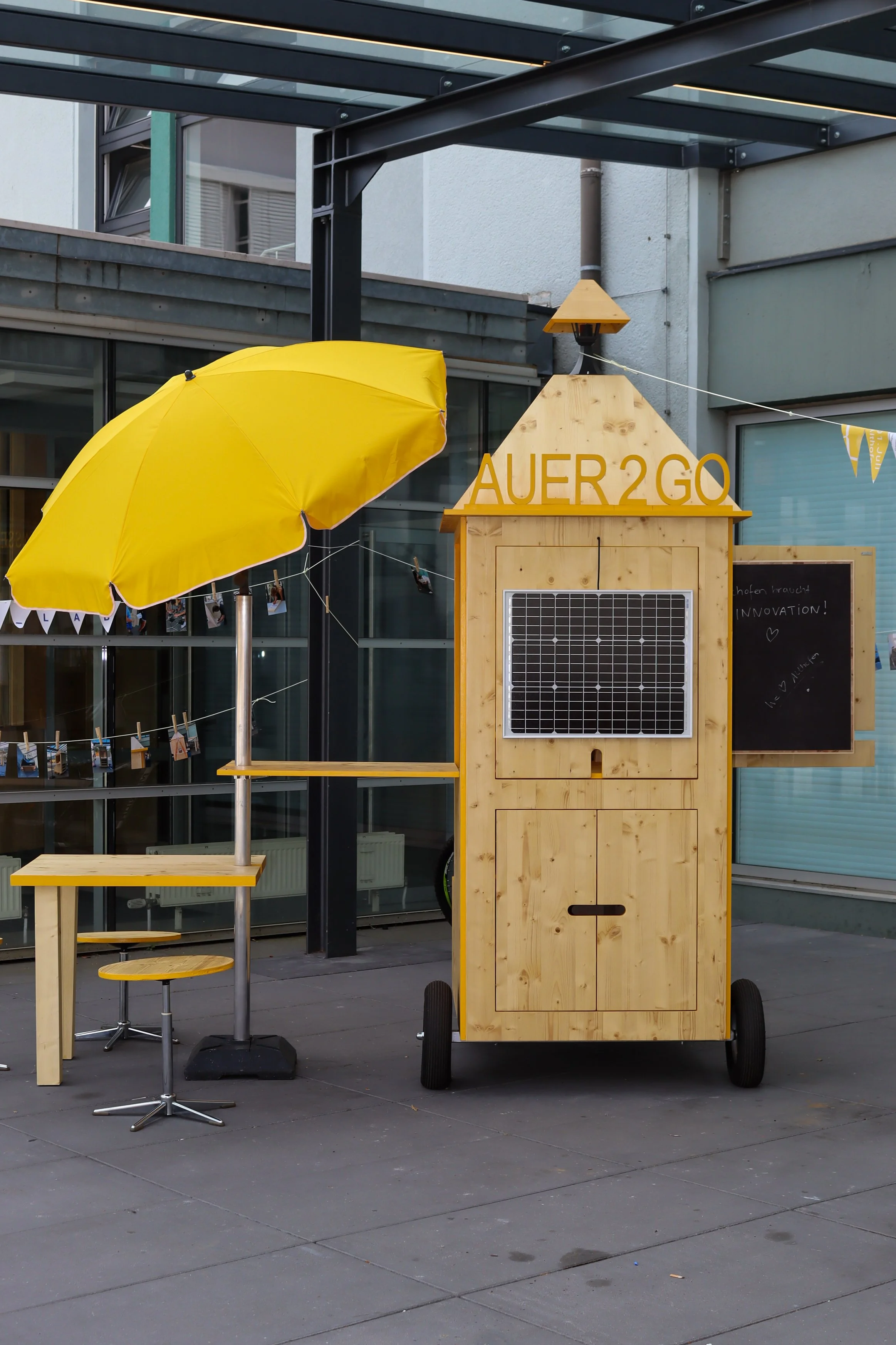 Der AUER2GO ist ein rund zwei Meter hohes, fahrbares Holzobjekt, das sich aufklappen lässt und Arbeitsflächen, Tisch mit Schirm, Pinnwand, Stauraum und integriertes Licht bietet – nutzbar drinnen wie draußen, tagsüber wie nachts. Benannt nach Carl Auer von Welsbach, dem aus Althofen stammenden Erfinder, steht er als Sinnbild lokaler Innovationskraft.